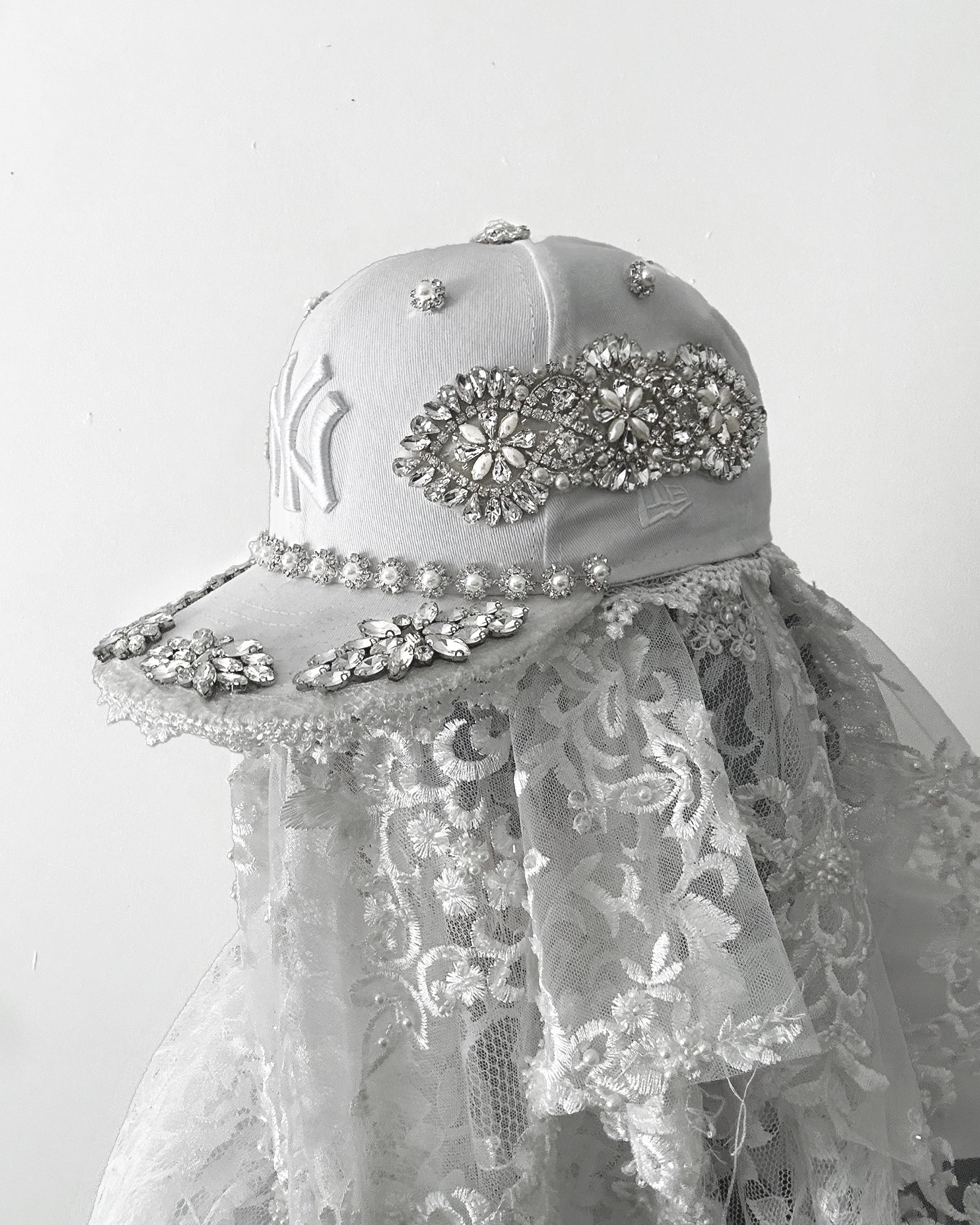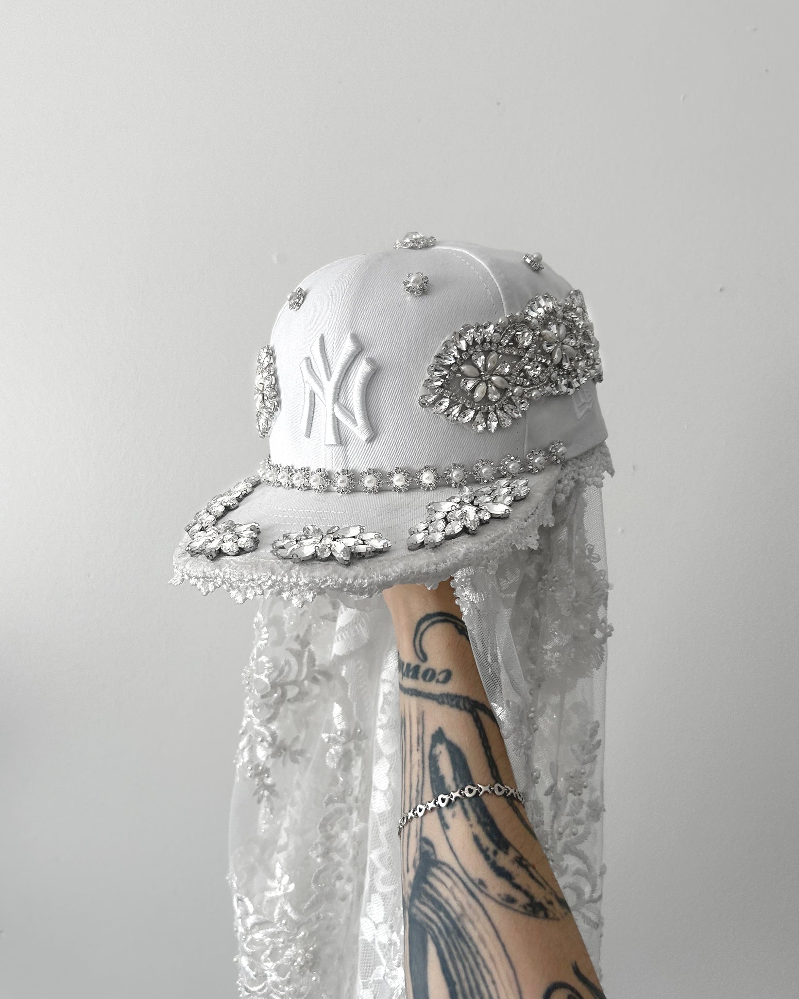 An elevated reinterpretation of a cultural icon, this handcrafted New Era fitted transcends traditional streetwear into the realm of couture. Each piece begins with an authentic New Era blank—offered in NY, ATL, and LA—and is meticulously transformed by hand with intricate crystal and pearl embellishments and refined crystalized lace detailing.